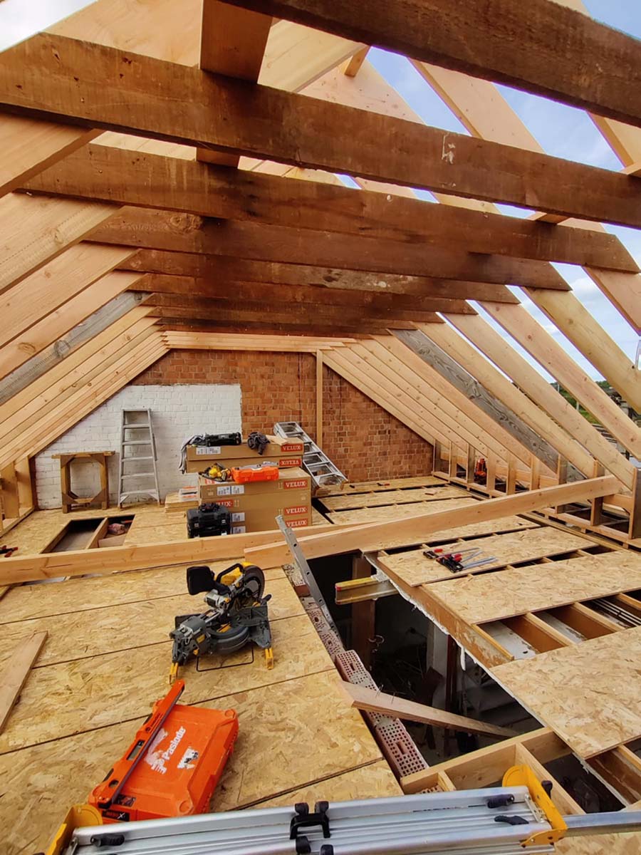 Op het gelijkvloers hebben wij een nieuwe roostering geplaatst, samen met de opstanden en OSB-platen, als solide basis voor de verdere afwerking.